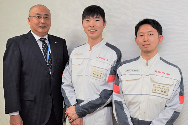 (写真は、ホンダディーラーに就職した当校の卒業生)