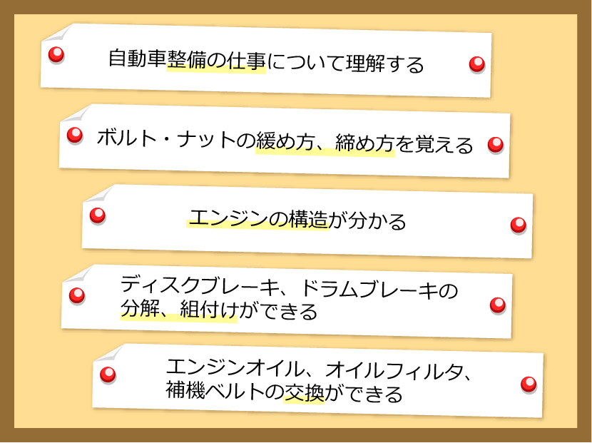 お越しいただく5日間では、工具の説明から安全に関わるブレーキはもちろん、心臓部であるエンジンのことや電子部品まで、はたまた自動車整備業界のウラ話も。体験の枠を超えた内容を用意しています。